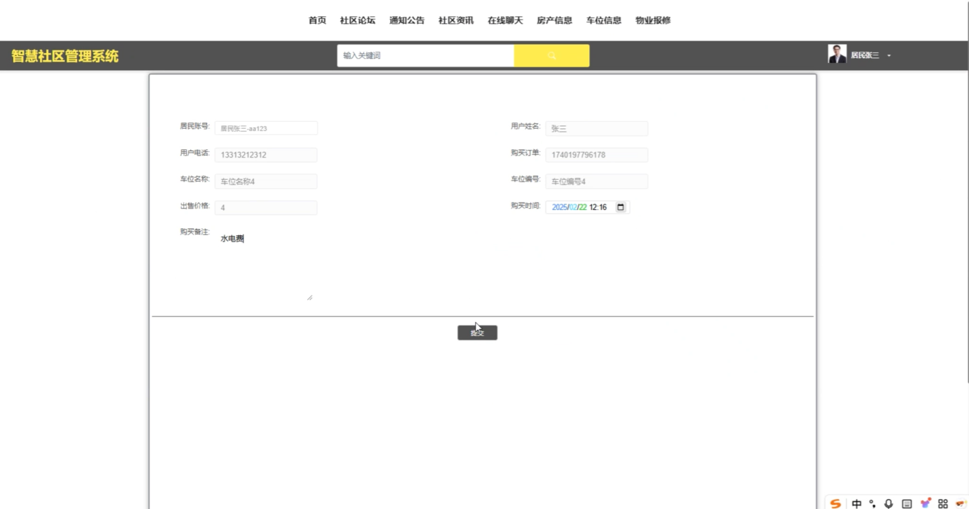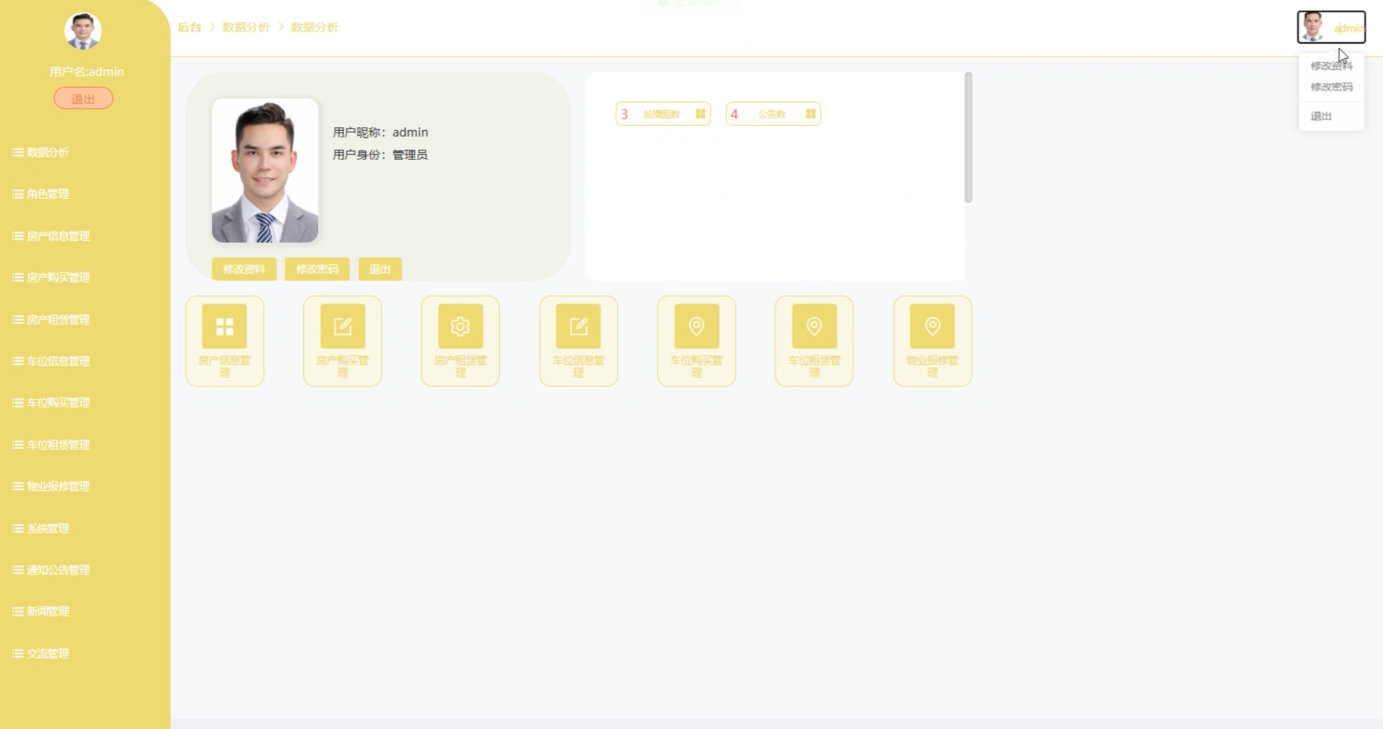 The system adopts a front-end and back-end separation architecture, the front-end realizes user interface interaction based on the Vue.js framework, and the back-end adopts Spring Boot as the core development framework, combined with MySQL database for data storage and management. The system mainly realizes functional modules such as real estate information management, parking space leasing and purchase, property repair, community forum, notice and announcement, etc., and meets the needs of residents, property owners and administrators by building a smart community management platform with comprehensive functions, convenient operation, safety and reliability. In addition, the system also introduces a role permission management mechanism to ensure that the operation permissions of different user roles are clear and unambiguous.
