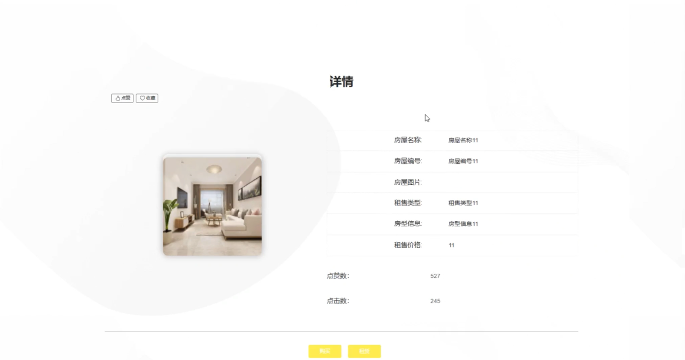 房产信息:查询房屋名称、编号、图片、租售类型等详细信息,支持购买或租赁操作。可对感兴趣的房产进行点赞、收藏或评论。