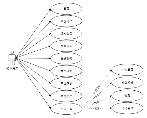 物业用户的核心职责是为居民提供高效的服务并维护社区正常运转。物业用户通过首页快速访问常用功能模块,提高工作效率;在社区论坛中回复居民问题,解答疑惑并维护社区和谐;发布通知公告和新闻资讯,确保信息及时传达;管理房产和车位信息,处理居民的购买或租赁申请;接收并分配物业报修任务,跟踪维修进度,保障居民生活质量。物业用户用例图如图3-2所示。