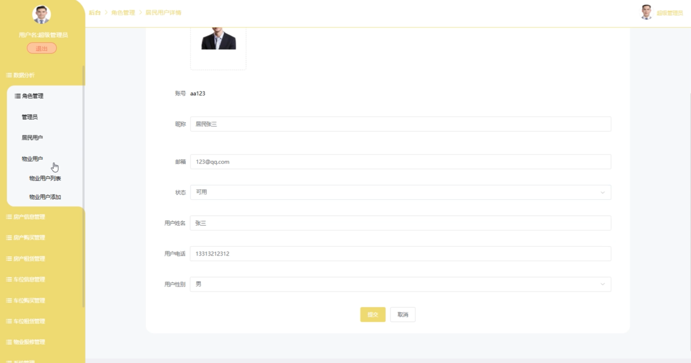 角色管理:添加、删除或修改用户角色(居民、物业、管理员),确保权限清晰明确。支持分配具体功能权限。