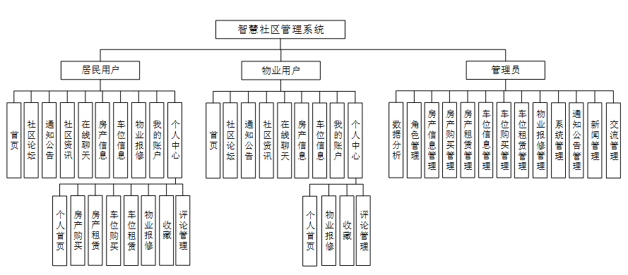 本系统旨在满足居民、物业和管理员三大角色在智慧社区管理中的多样化需求,通过提供房产信息管理、车位租赁与购买、物业报修、社区论坛、通知公告等核心功能模块,实现社区资源的高效配置与便捷服务。系统以用户为中心,注重交互体验与功能实用性,确保不同角色能够根据自身需求完成相关操作,同时通过数据分析、权限管理和系统维护等功能提升整体管理效率。具体功能描述如下: