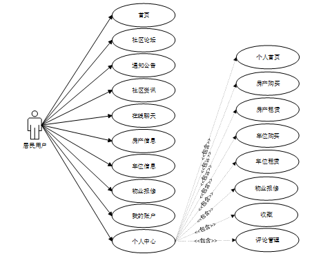 居民用户的主要需求是获取社区信息、参与互动并解决日常生活问题。居民可以通过首页浏览社区动态和通知公告,确保及时了解社区事务;在社区论坛中发布或回复帖子,促进邻里交流;查看房产和车位信息,完成购买或租赁操作以满足居住需求;提交物业报修申请,跟踪维修进度以解决生活中的问题;管理个人中心内容,如收藏、评论和个人资料等,提升使用便捷性。居民用户用例图如图3-1所示。