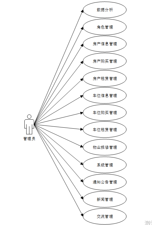管理员负责系统的整体管理和数据维护,确保平台稳定运行并满足多方需求。管理员通过数据分析功能统计社区基本信息及功能模块使用情况,辅助决策优化;管理用户角色权限,确保不同角色的功能边界清晰;维护房产、车位、报修等相关信息,保证数据准确性和完整性;管理轮播图、通知公告和新闻内容,控制信息展示质量;审核社区论坛内容,删除不当言论,维护平台秩序和公信力。管理员角色用例图如图3-3所示。
