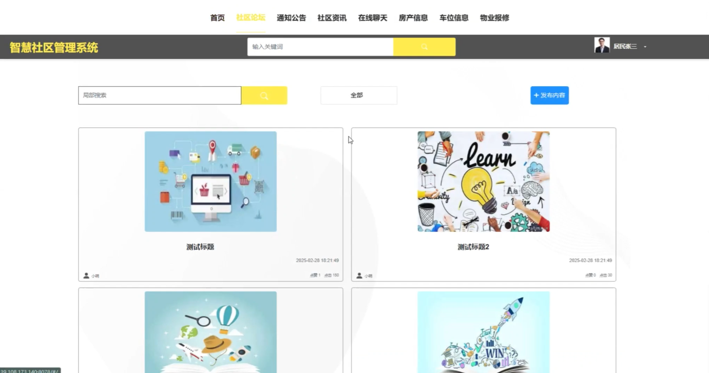 社区论坛:居民可发布帖子、评论和点赞,促进邻里交流互动。支持按主题分类浏览,方便查找感兴趣的内容。
