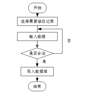 用户首先选择需要修改的记录,输入修改后的数据,系统判断输入数据是否合法。若数据不合法,提示重新输入;若数据合法,则将修改后的数据写入数据库,完成操作后流程结束。修改信息流程图如图3-8所示。