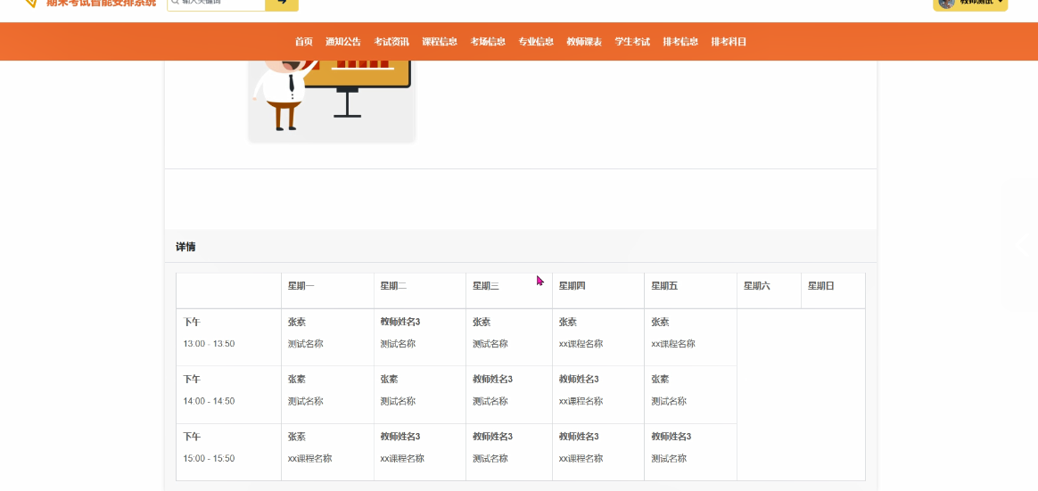 提供了教师一学期中所有课程的教学安排概览,包括每门课程的具体上课时间、地点以及对应的班级信息。教师课表界面如图5-8所示。