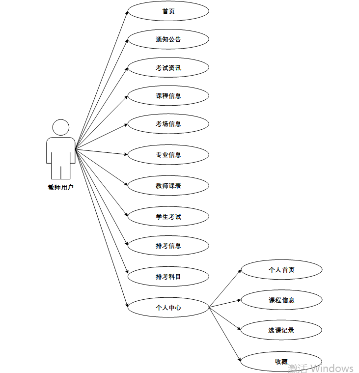 教师用户可查看首页、通知公告、考试资讯、课程信息、考场信息、专业信息、教师课表、学生考试、排考信息、排考科目、个人中心(个人首页、课程信息、选课记录、收藏)。