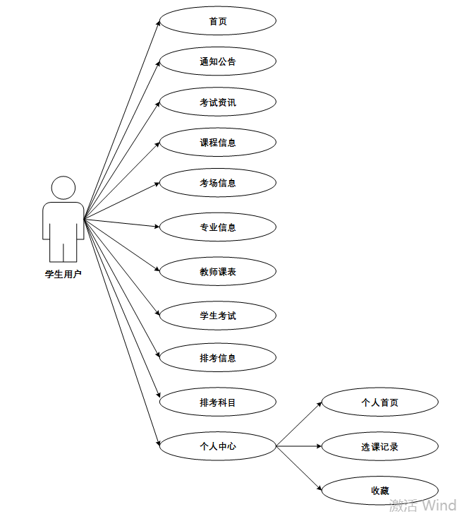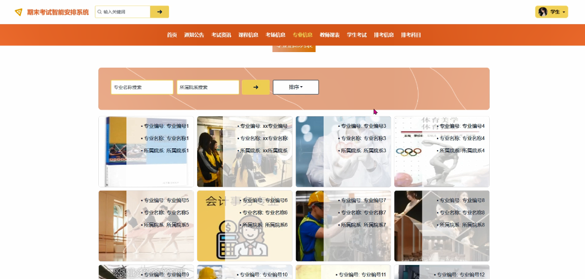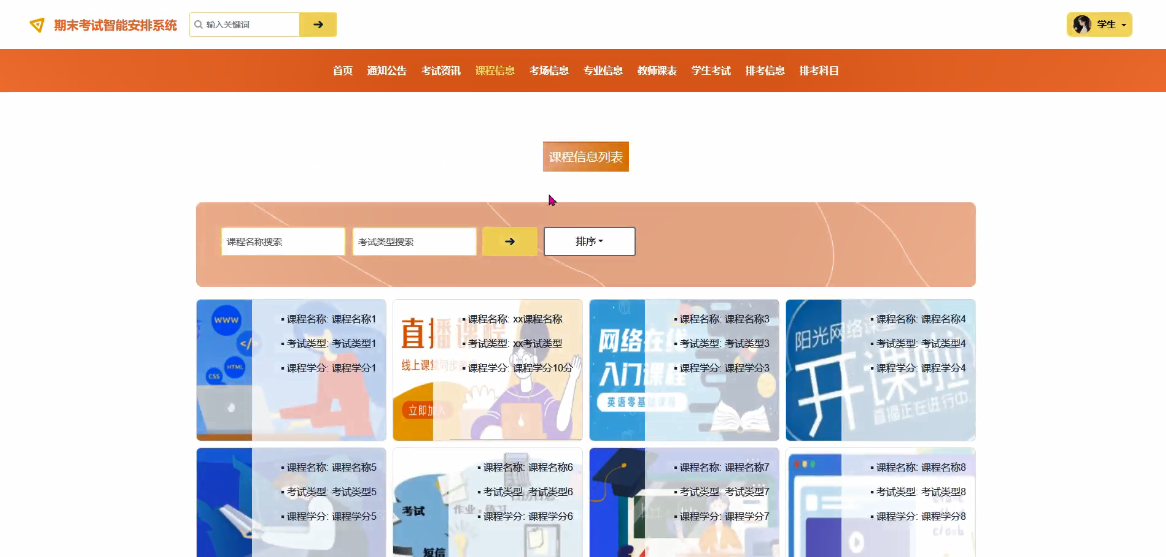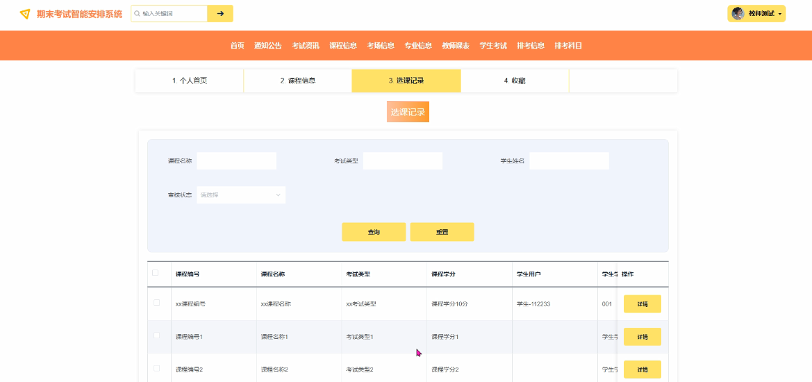 学生用户可查看首页、通知公告、考试资讯、课程信息、考场信息、专业信息、教师课表、学生考试、排考信息、排考科目、个人中心(个人首页、选课记录、收藏)。