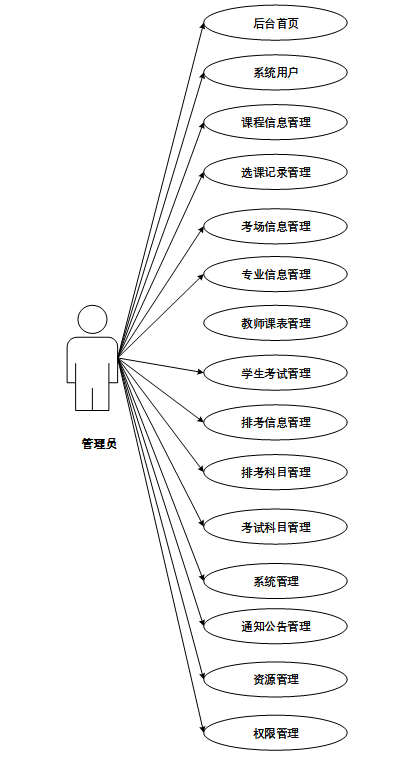 管理员可查看后台首页、系统用户、课程信息管理、选课记录管理、考场信息管理、专业信息管理、教师课表管理、学生考试管理、排考信息管理、排考科目管理、考试科目管理、系统管理、通知公告管理、资源管理、权限管理。