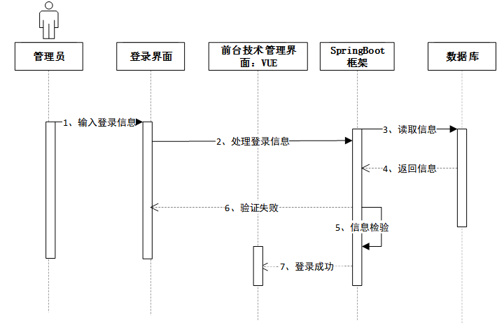 管理员输入登录信息后,登录界面将信息传递至前台管理界面,随后通过SpringBoot框架读取数据库中的用户信息并返回。系统验证信息,若验证成功则登录成功,若验证失败则返回错误提示。登录时序图如图4-4所示。
