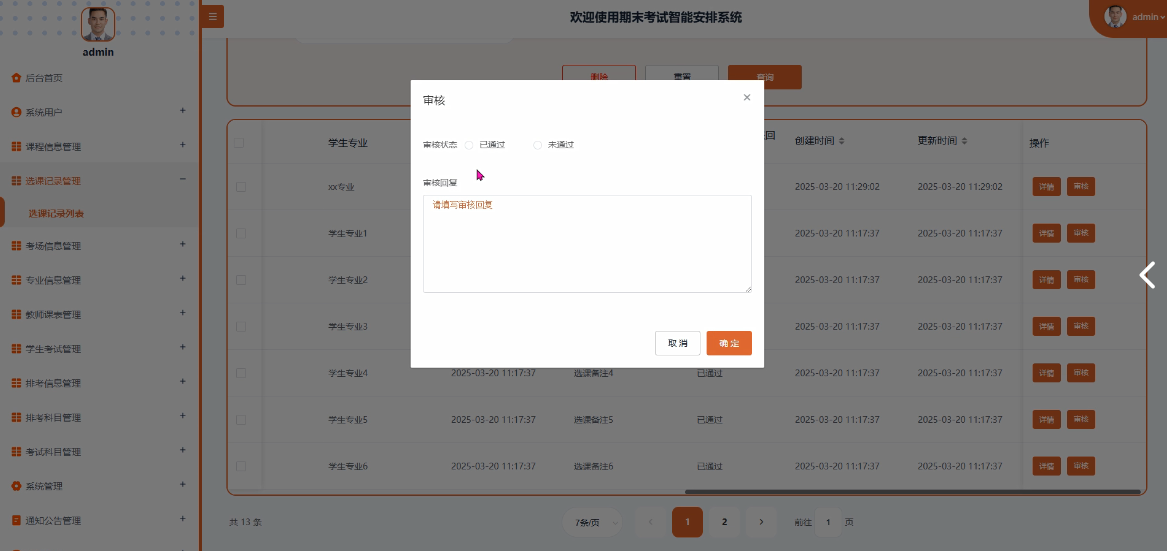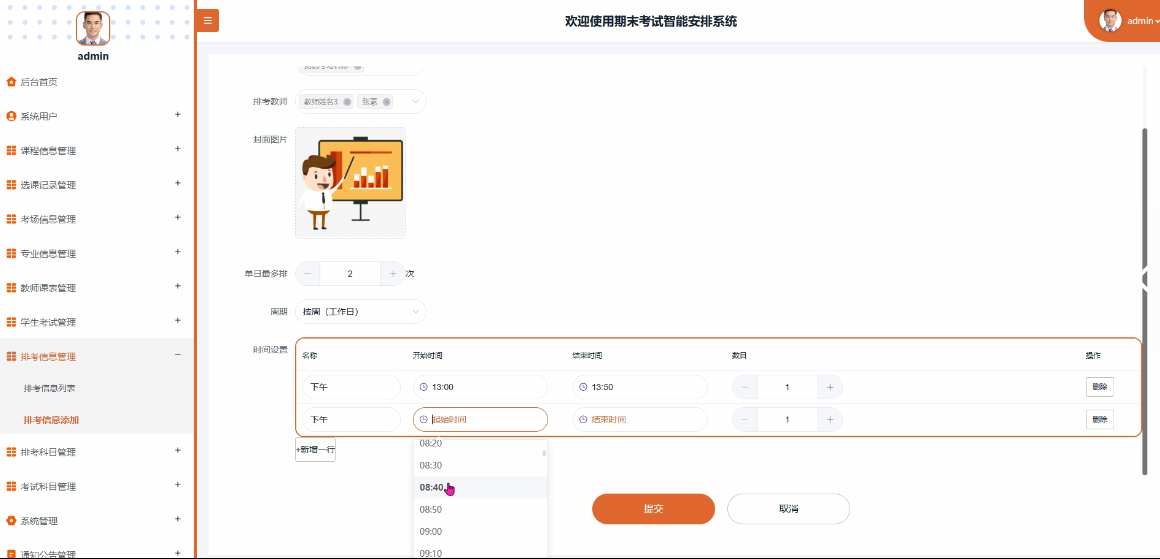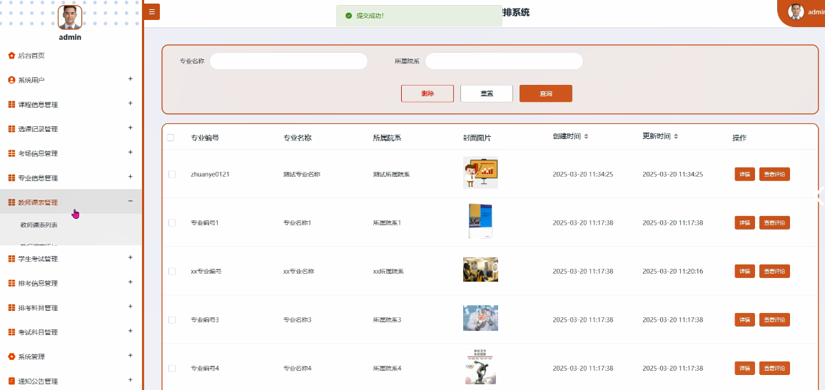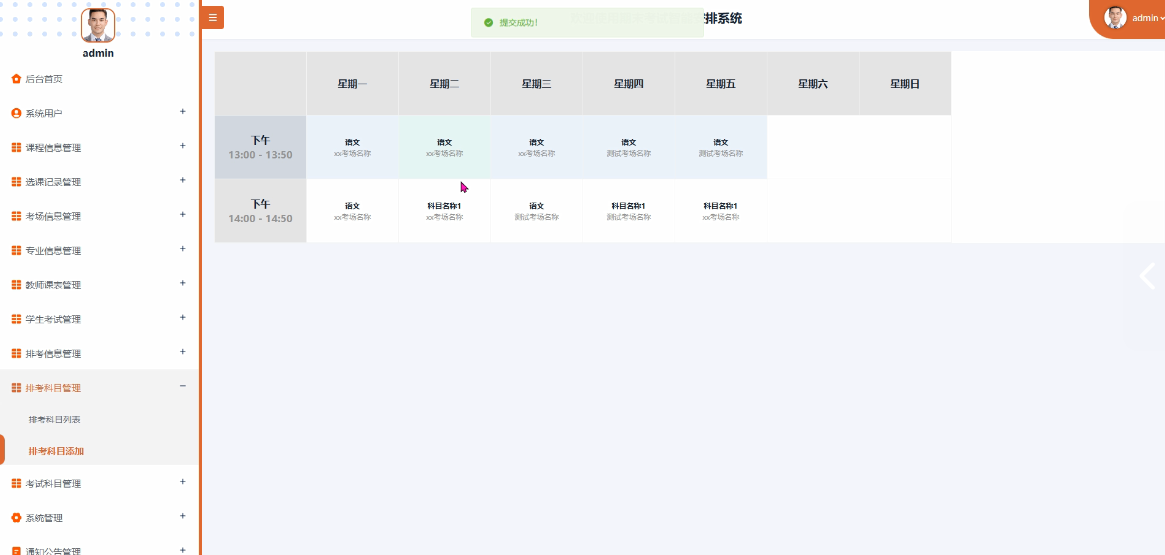 在实践意义上,该系统显著提升了考试安排和管理的效率与准确性。对于学生而言,他们能够更便捷地获取考试资讯、查询考场信息和个人选课记录,从而减少因信息不对称造成的困扰;教师则可以通过系统更好地准备和调整教学计划,查看排考信息,确保教学工作的顺利进行;而对于管理员来说,系统提供的全面后台管理工具极大地简化了从课程信息维护到考试科目规划等一系列复杂的管理工作,减轻了工作负担,提高了工作效率。