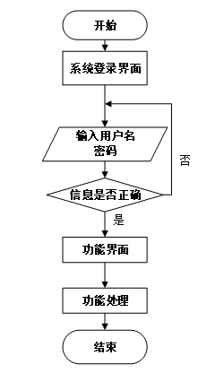 用户首先进入系统登录界面,输入用户名和密码后,系统验证信息是否正确。若验证失败,返回登录界面重新输入;若验证成功,则进入功能界面,执行相应功能处理后结束操作流程。操作流程如图3-6所示。