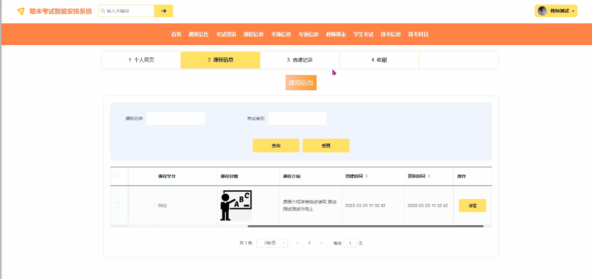 | 查看课程信息测试 | 登录系统 进入课程信息页面 点击课程详情查看完整信息 | 无 | 符合预期 |