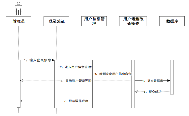 管理员输入登录信息后,进入用户信息管理模块,选择增删改查操作并提交命令至数据库。数据库执行操作后返回成功状态,系统显示用户管理界面并提示操作成功。管理员修改用户信息时序图如图4-5所示。