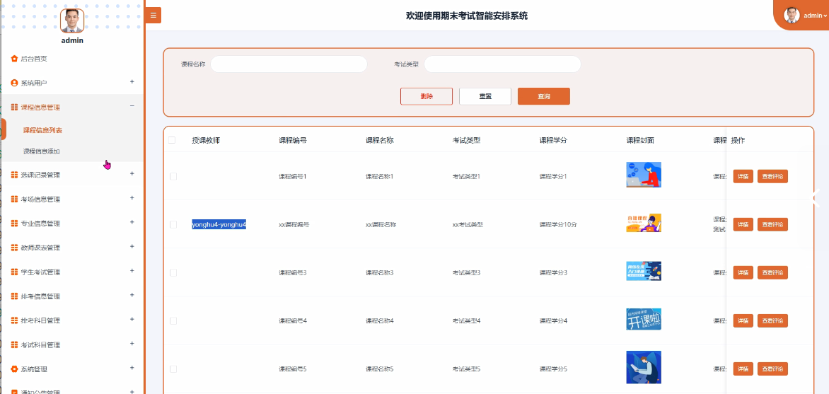 负责维护课程目录,包括添加新课程、更新课程详情(如授课教师、课程学分、考试类型等),以及删除过期或不再开设的课程信息。课程信息管理界面如图5-9所示。