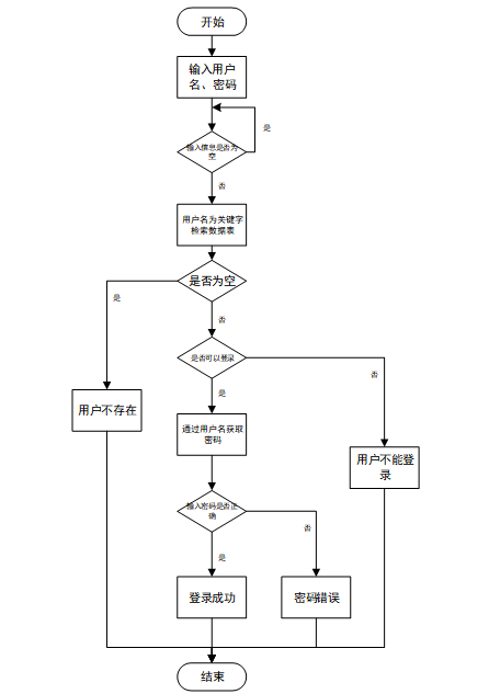 用户输入用户名和密码后,系统先检查输入是否为空,再验证用户名是否存在,若存在则通过用户名获取密码并校验。若密码正确则登录成功,否则提示密码错误。若用户名不存在或无法登录,提示用户操作无效。如图3-5所示。