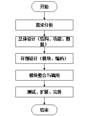 系统开发流程的主要步骤,从需求分析到系统完成的全过程。流程包括需求分析、总体设计(结构、功能、数据)、详细设计(模块、编码)、模块整合与调用,以及测试、扩展和完善,最终完成系统的开发。本系统的开发流程如图3-4所示