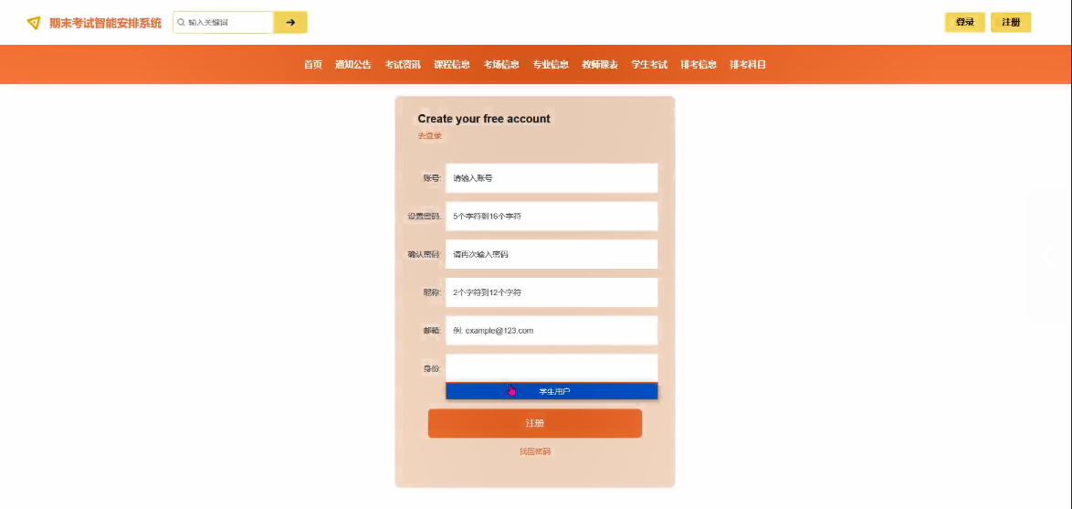 本研究针对当前教育管理中面临的考试安排复杂、信息处理效率低下等问题,提出并实现了一个基于Spring Boot框架,并结合前端Vue与数据库MySQL的期末考试智能安排系统。通过为学生、教师及管理员提供定制化的功能模块,该系统有效提升了教育资源的利用效率和考试组织的准确性。对于学生用户,系统提供了从注册登录到选课记录、收藏等全方位的服务,极大地增强了学习体验;教师则能够通过个人中心、课程信息和排考信息等功能更好地规划教学活动;而管理员拥有了包括后台首页、系统用户管理、权限管理在内的全面管理工具,确保了系统的高效运行与安全性。