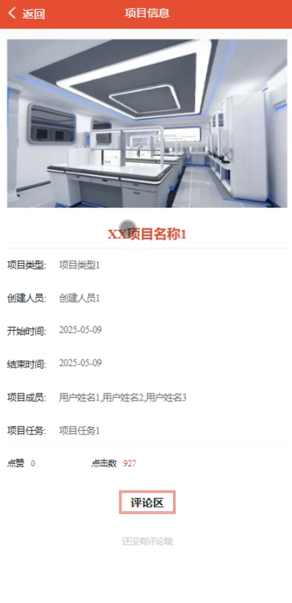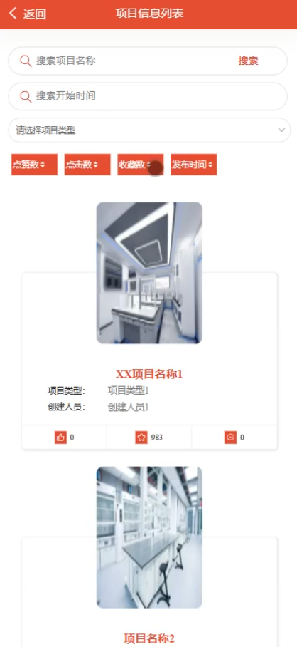 - 项目信息:用户可以查看实验室内的所有科研项目详情。并可选择项目类型进行筛选。每个项目以卡片形式展示,包含项目图片、名称、类型、创建人员等基本信息,以及点赞数、点击数、收藏数和发布时间等互动数据。