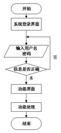 用户首先进入系统登录界面,输入用户名和密码后,系统验证信息是否正确。若验证失败,返回登录界面重新输入,若验证成功,则进入功能界面,执行相应功能处理后结束操作流程。操作流程如下图所示。