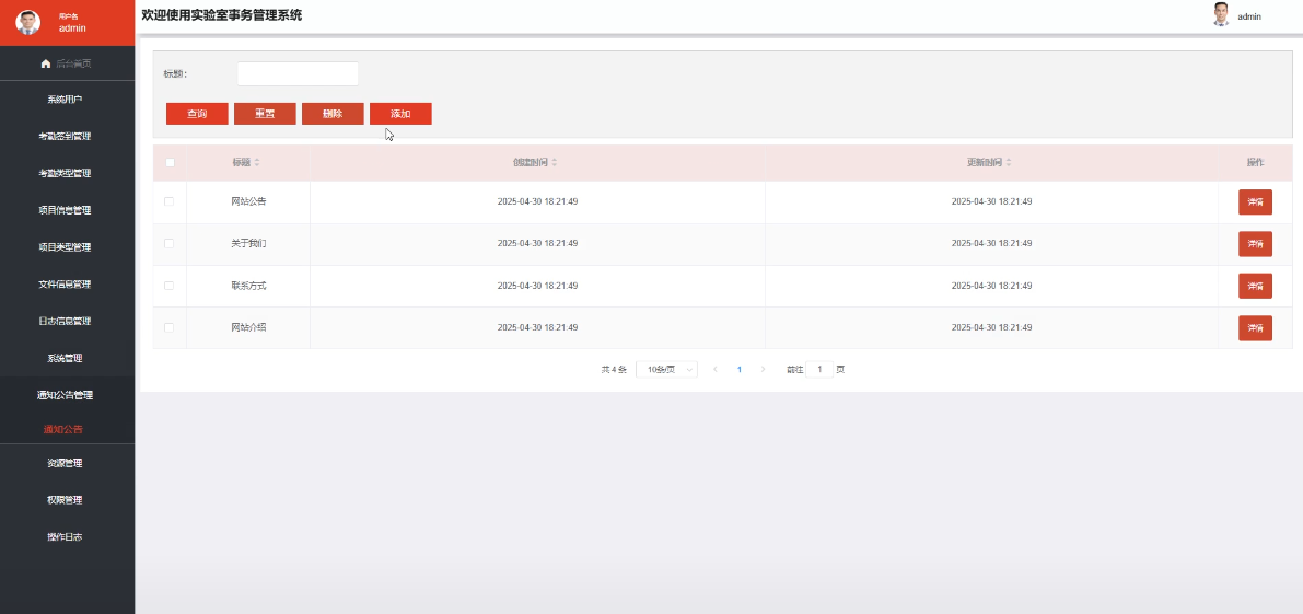 - 通知公告管理:管理员可以发布、编辑和删除各类通知公告,如实验安排、紧急通知、放假安排等,确保信息及时传达给所有用户,避免遗漏和延误。