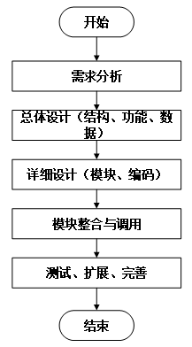 系统开发流程的主要步骤,从需求分析到系统完成的全过程。流程包括需求分析、总体设计(结构、功能、数据)、详细设计(模块、编码)、模块整合与调用,以及测试、扩展和完善,最终完成系统的开发。本系统的开发流程如下图所示