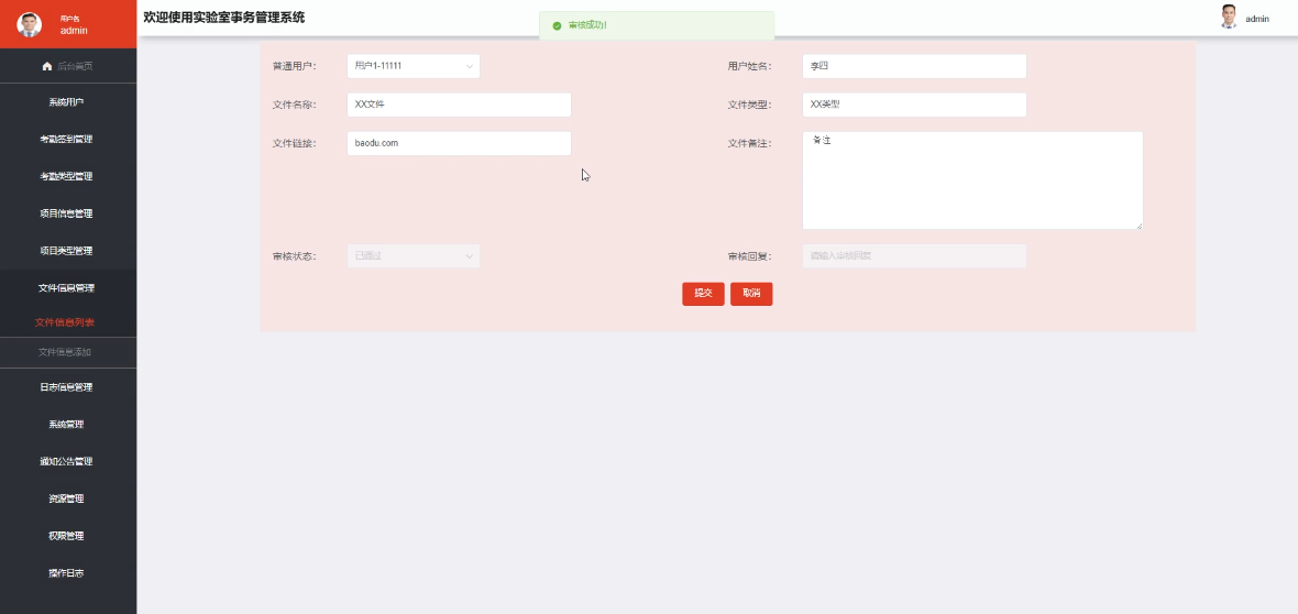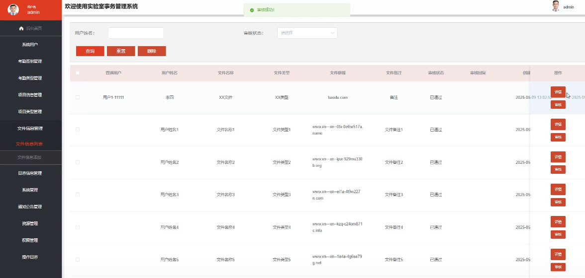- 文件信息:提供一个集中的平台让用户上传、下载和共享相关文件资料,便于资料管理和查阅,支持实验室工作的顺利开展。