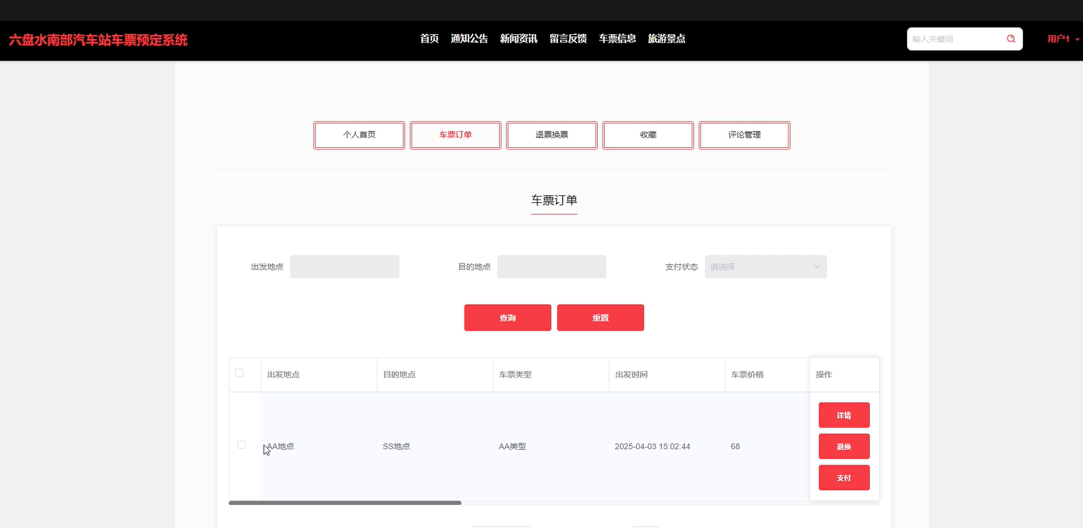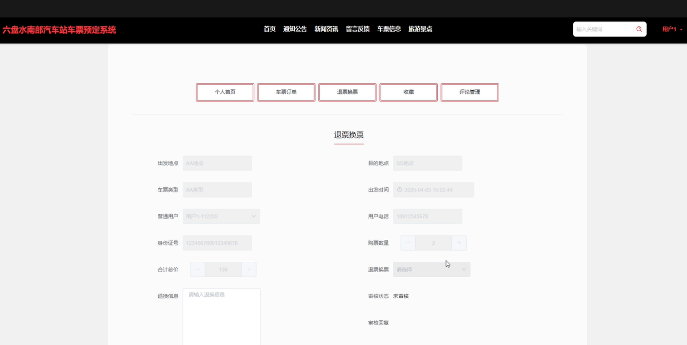 (10)个人中心:包含个人首页、车票订单、退票换票、收藏、评论管理等的功能,车票订单:主要展示该用户的车票订单详情,并对车票进行支付,点击信息可进行查询、重置等操作;退票换票:主要展示该用户的退票换票记录详情,退票换票需后台审核。点击信息可进行查询、重置等操作;收藏:用户可收藏自己喜欢的信息,方便日后自己查看购票;评论管理:用户可查看系统评论信息和交流心得注意事项等功能。可查询、重置、删除等操作。
