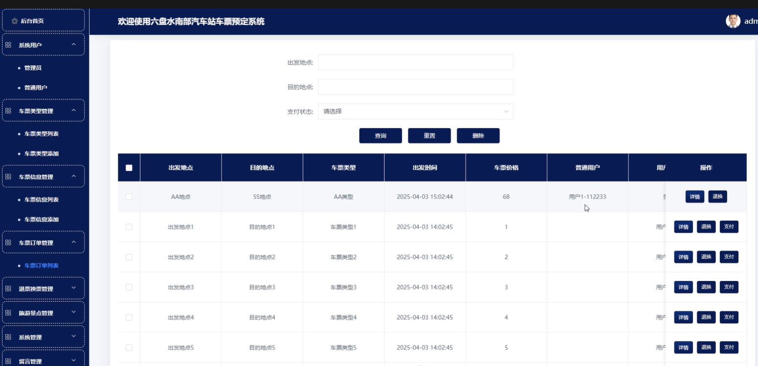 Springboot六盘水南部汽车站车票预定系统包含普通用户和管理二个角色划分,每个角色对应的主要功能如下: