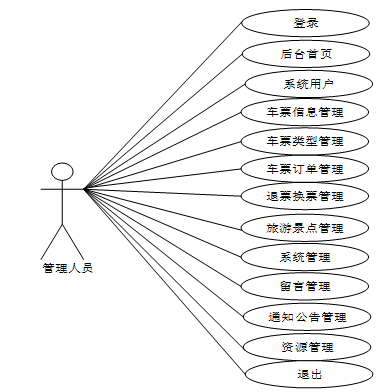 Springboot六盘水南部汽车站车票预定系统的设计与实现中管理员涉及登录、后台首页、系统用户、车票信息管理、车票类型管理、车票订单管理、退票换票管理、旅游景点管理、系统管理、资源管理、留言管理、通知公告管理等,管理员对应的用例图如图3.2所示: