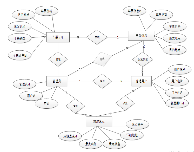 Springboot六盘水南部汽车站车票预定系统的管理员、普通用户、车票信息、车票订单、旅游景点等E-R实体关系图。