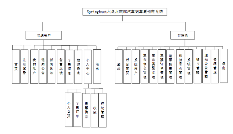 Springboot六盘水南部汽车站车票预定系统的网站功能模块主要涉及有普通用户和管理员二个角色。每个角色对应的功能模块如图4.1所示。