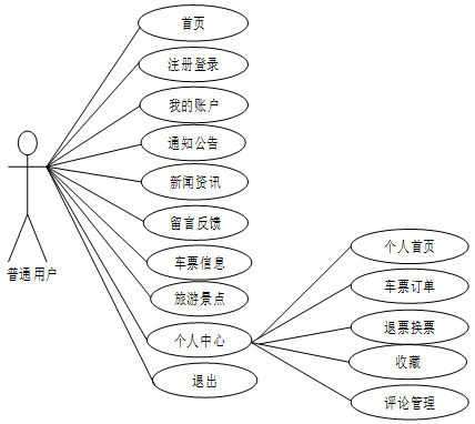 Springboot六盘水南部汽车站车票预定系统中普通用户包含注册登录、首页、我的账户、通知公告、新闻资讯、车票信息、旅游景点、个人中心等功能模块,对应角色用例图如图3.1所示: