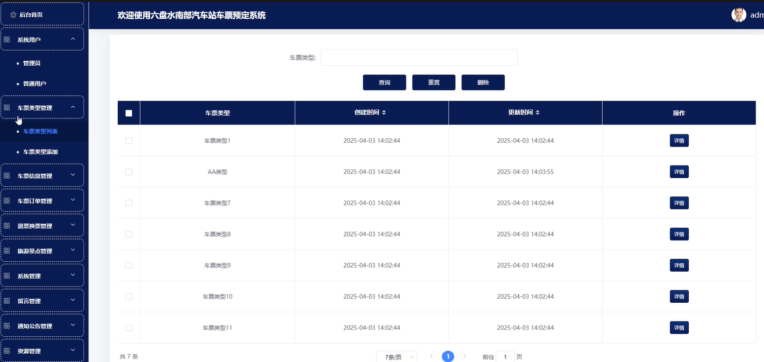 (4)车票类型管理:包含车票类型列表和车票类型添加功能。车票类型列表:主要管理所有车票类型信息,可进行增删改查等操作。车票类型添加:可手动添加车票类型数据。添加的信息可在前台展示。