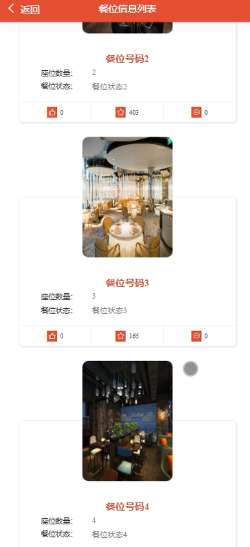 餐位信息:显示餐厅内各个餐位的实时状态(如空闲、已预订、已就餐等),用户可以选择合适的餐位进行预订或就餐。