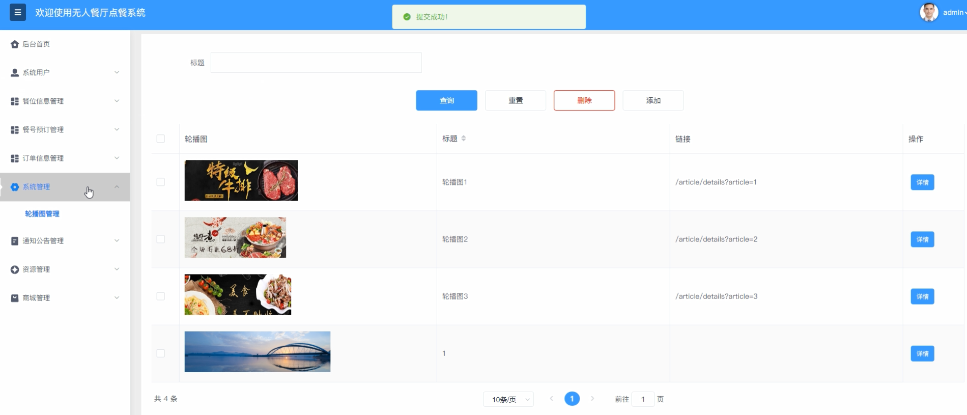 系统管理:管理员可以上传、修改和删除轮播图,设置轮播顺序和时间间隔,以吸引用户的注意力。