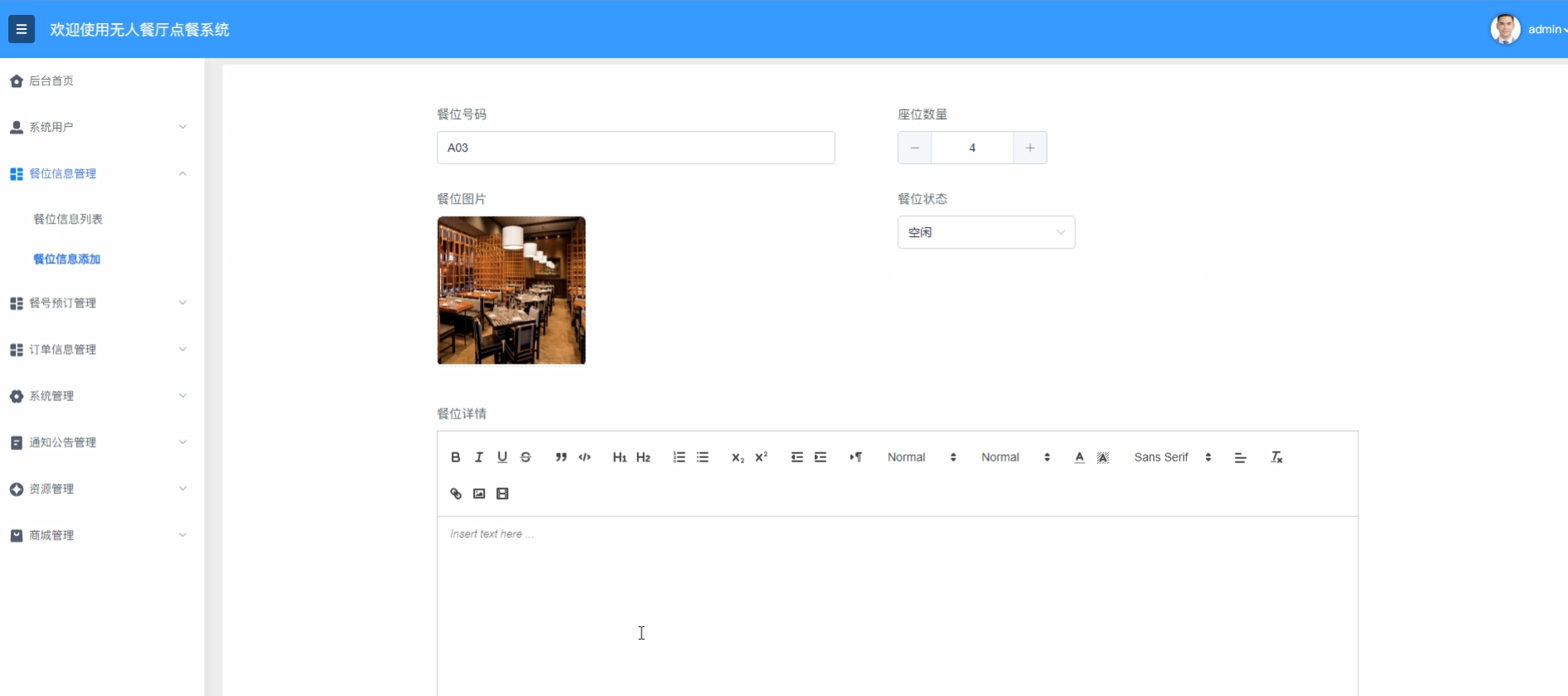 餐位信息管理:管理餐厅的餐位信息,包括添加、修改、删除餐位,设置餐位状态(空闲、已预订、已就餐等)。