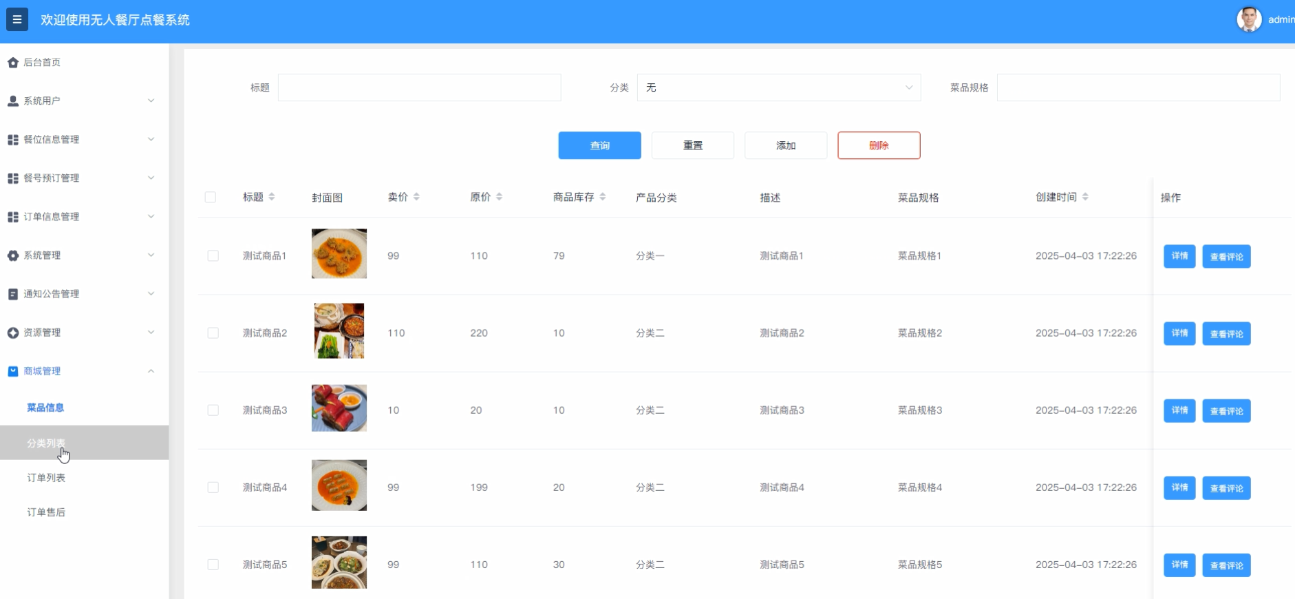 商城管理:包含菜品信息、分类列表、订单列表、订单售后功能。