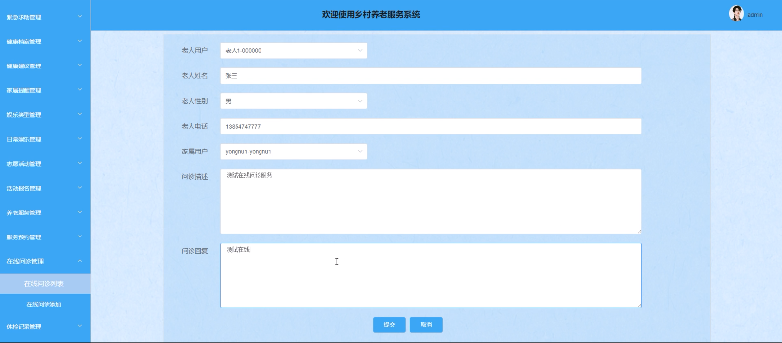 在线问诊管理:管理员可以查看老人的在线问诊咨询,并进行回复,帮助老人解决健康问题。