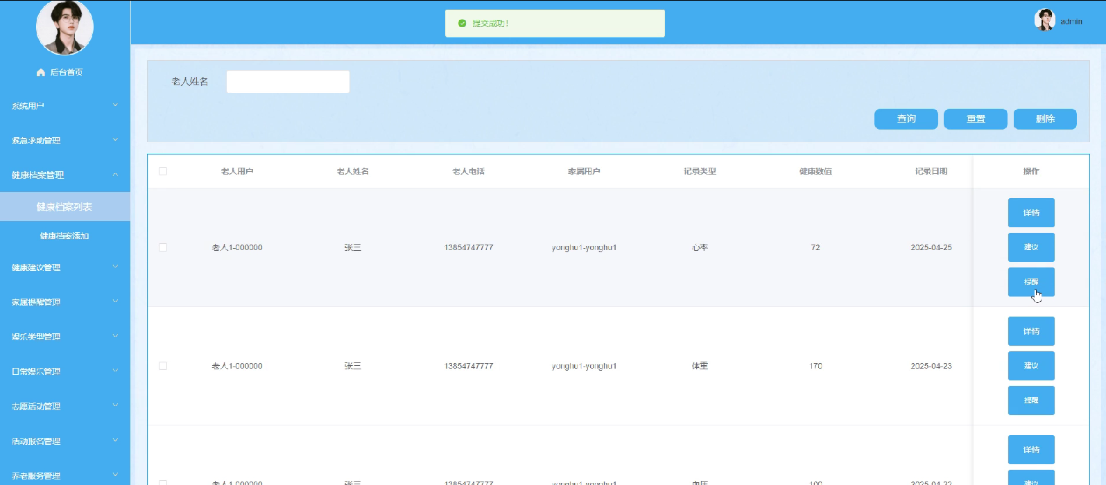 健康建议管理:管理员可以查询、重置或删除健康建议,确保建议的准确性和及时性。