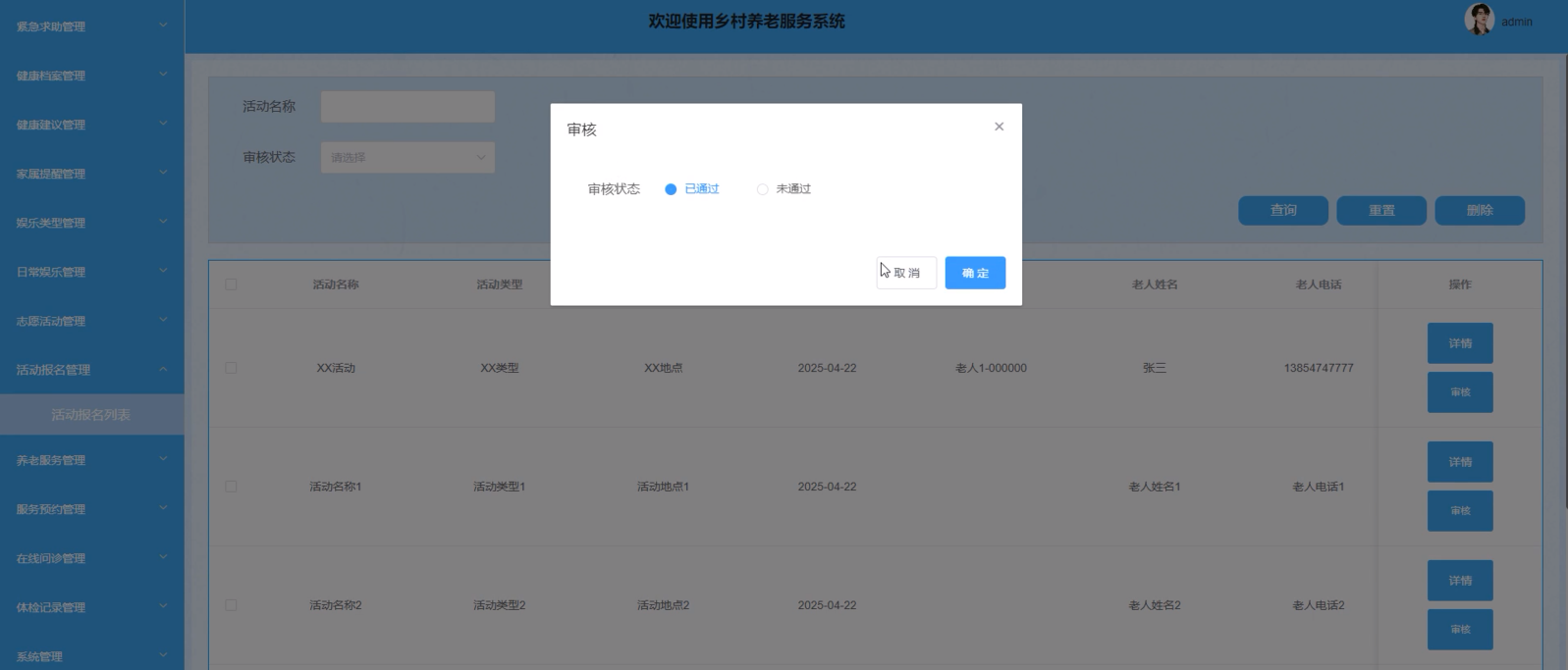 活动报名管理:管理员可以查看老人的活动报名情况,并对报名进行审核和回复,确保活动的顺利进行。
