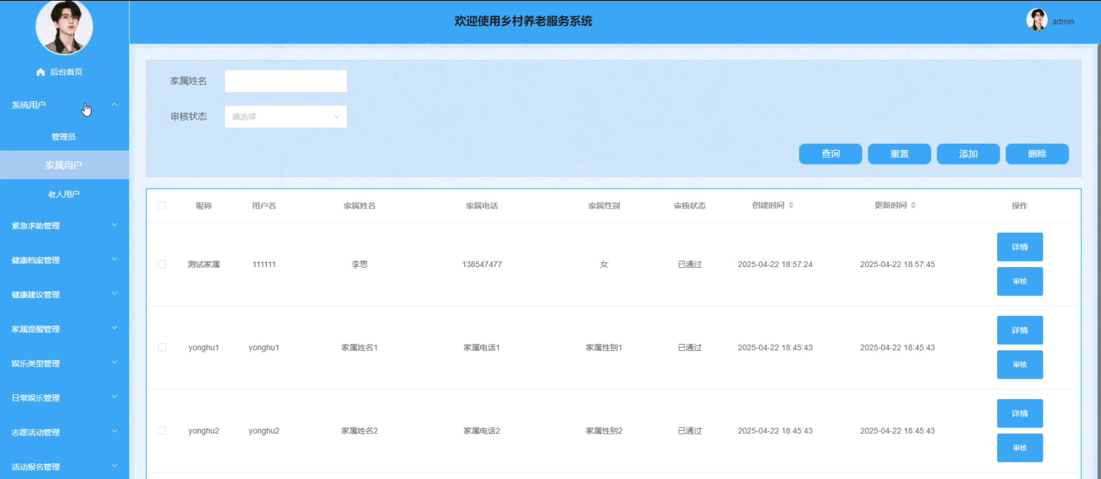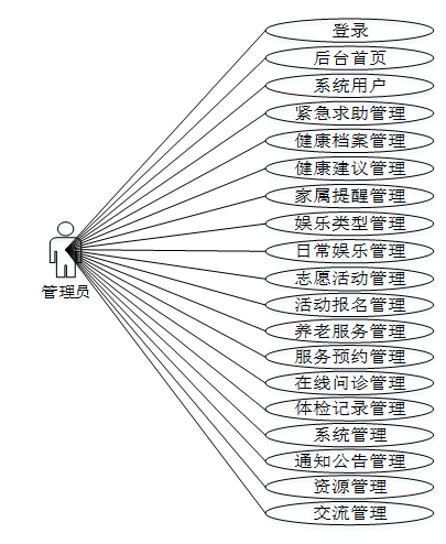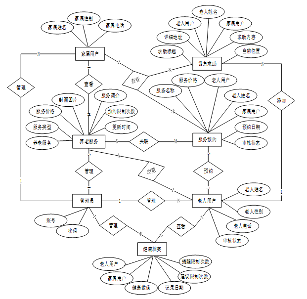 系统用户管理:系统中包含不同类型的用户,包括管理员、家属用户和老人用户。管理员可以对家属用户进行审核,以及对老人用户进行增加、删除、修改和查询操作。
