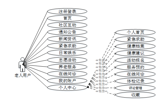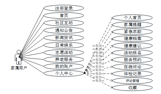 个人中心:个人中心是家属用户管理个人信息及监控老人的生活和健康的入口。家属可以查看老人添加的紧急求助信息并进行修改,查看老人的健康档案、家属提醒、健康建议、活动报名情况等。家属还可以查看老人预约的服务、在线问诊记录和体检记录,及时了解老人的健康动态。个人中心还提供收藏和评论管理功能,方便家属管理与平台的互动内容。