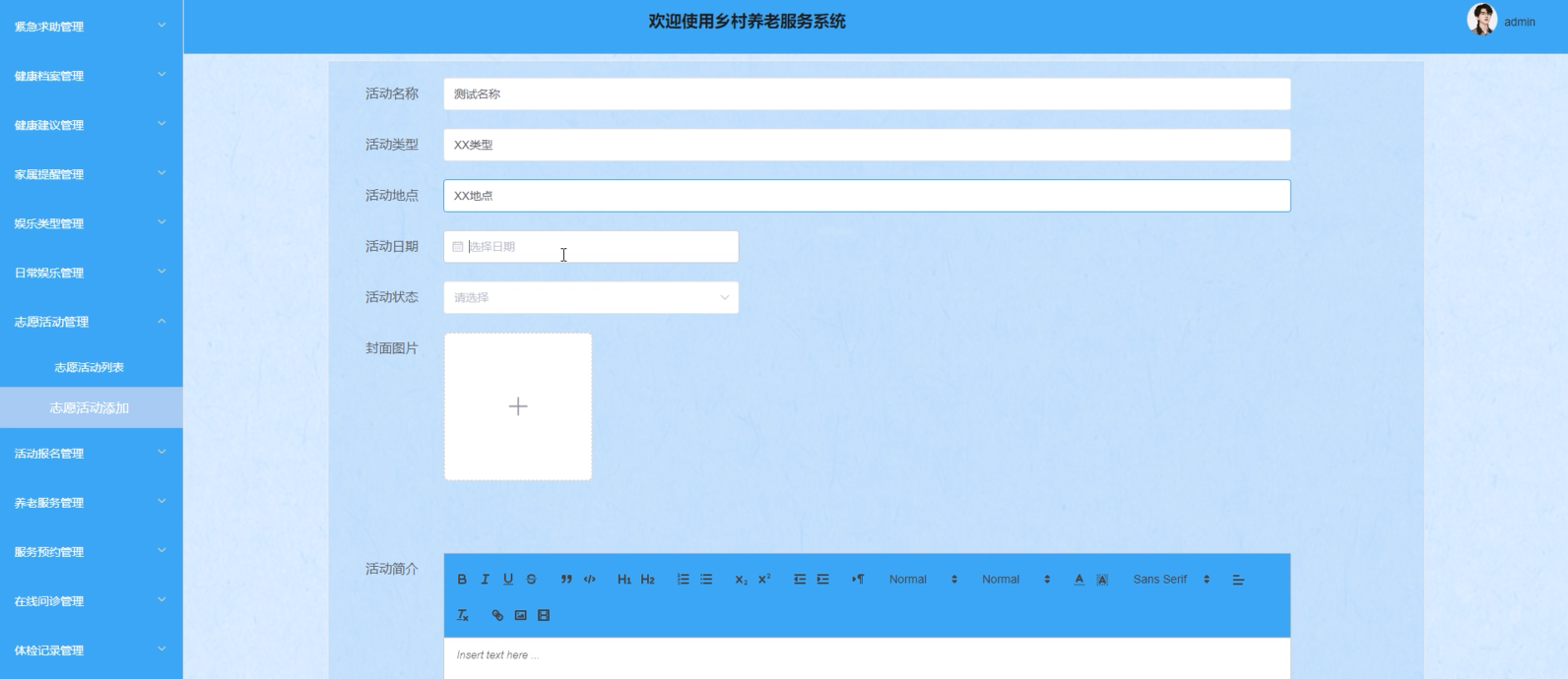志愿活动管理:管理员可以查询、重置、删除或添加志愿活动,并查看活动的评论,以了解活动的参与情况和老人的反馈。