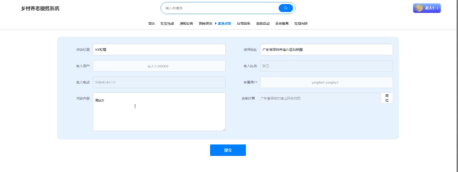 紧急求助:老人用户可以添加紧急求助人信息,包括详细地址、求助内容以及家属用户等,以便在紧急情况下快速获得联系。