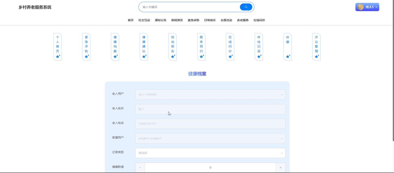 个人中心:个人中心是老人用户管理个人信息的综合入口,展示了健康档案统计图、紧急求助记录、健康建议等。通过个人中心,老人能够查看和管理每天的健康档案、活动报名、服务预约、体检记录等,同时能够查看并管理个人的收藏和评论,确保个人信息得到有效整理和更新。