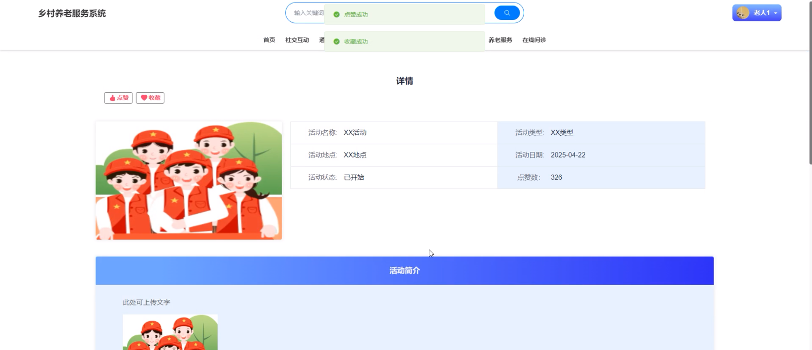 志愿活动:老人用户可以搜索并查看志愿活动的详细信息,通过点赞、收藏、评论来表达支持,并可直接报名参与。