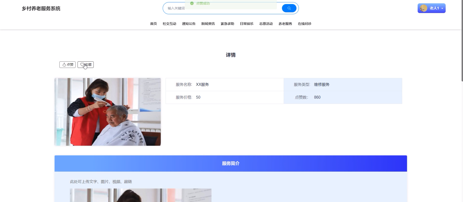 养老服务:老人用户可以搜索并查看养老服务的详细信息,通过点赞、收藏、评论来表达自己的需求,并可进行预约服务。