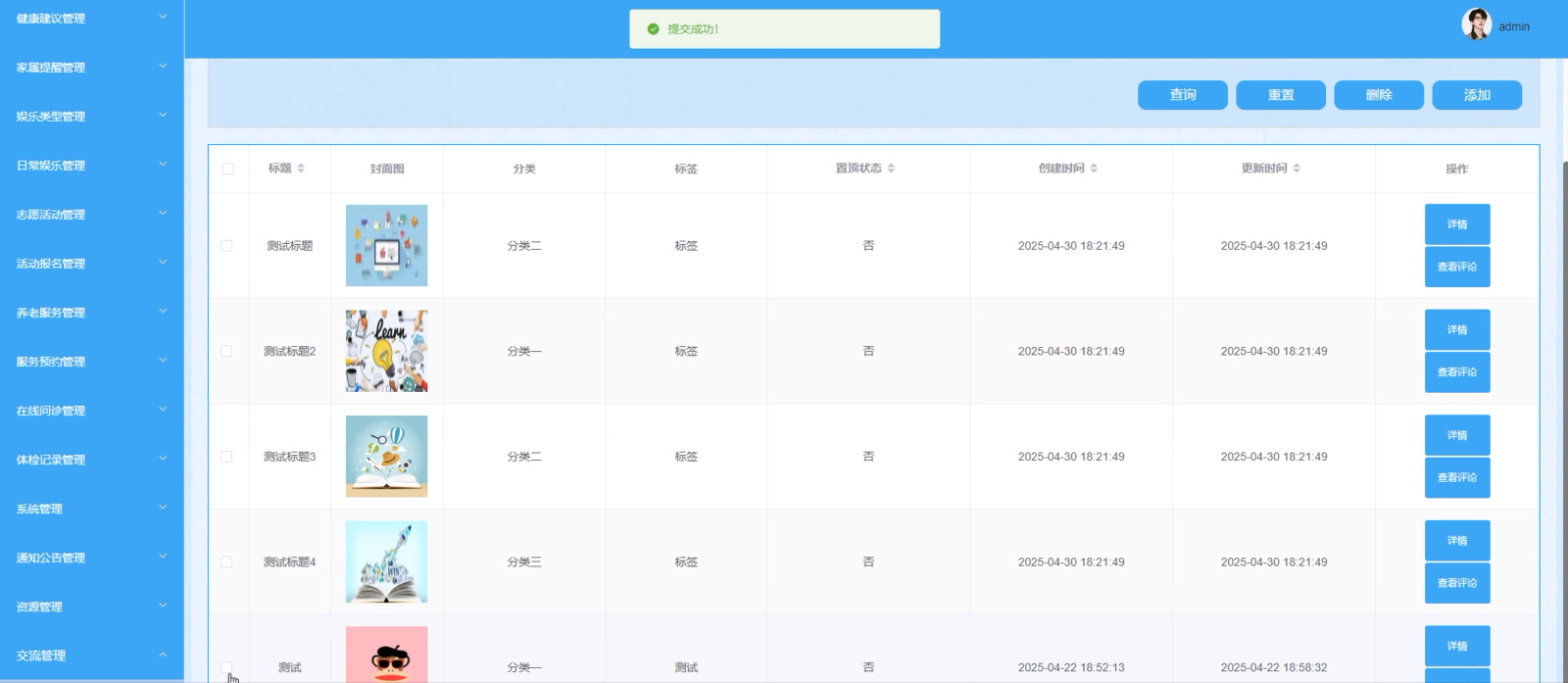 日常娱乐管理:管理员可以查询、重置、删除或添加老人的日常娱乐活动,并查看活动的评论,以评估活动的受欢迎程度和改进方向。