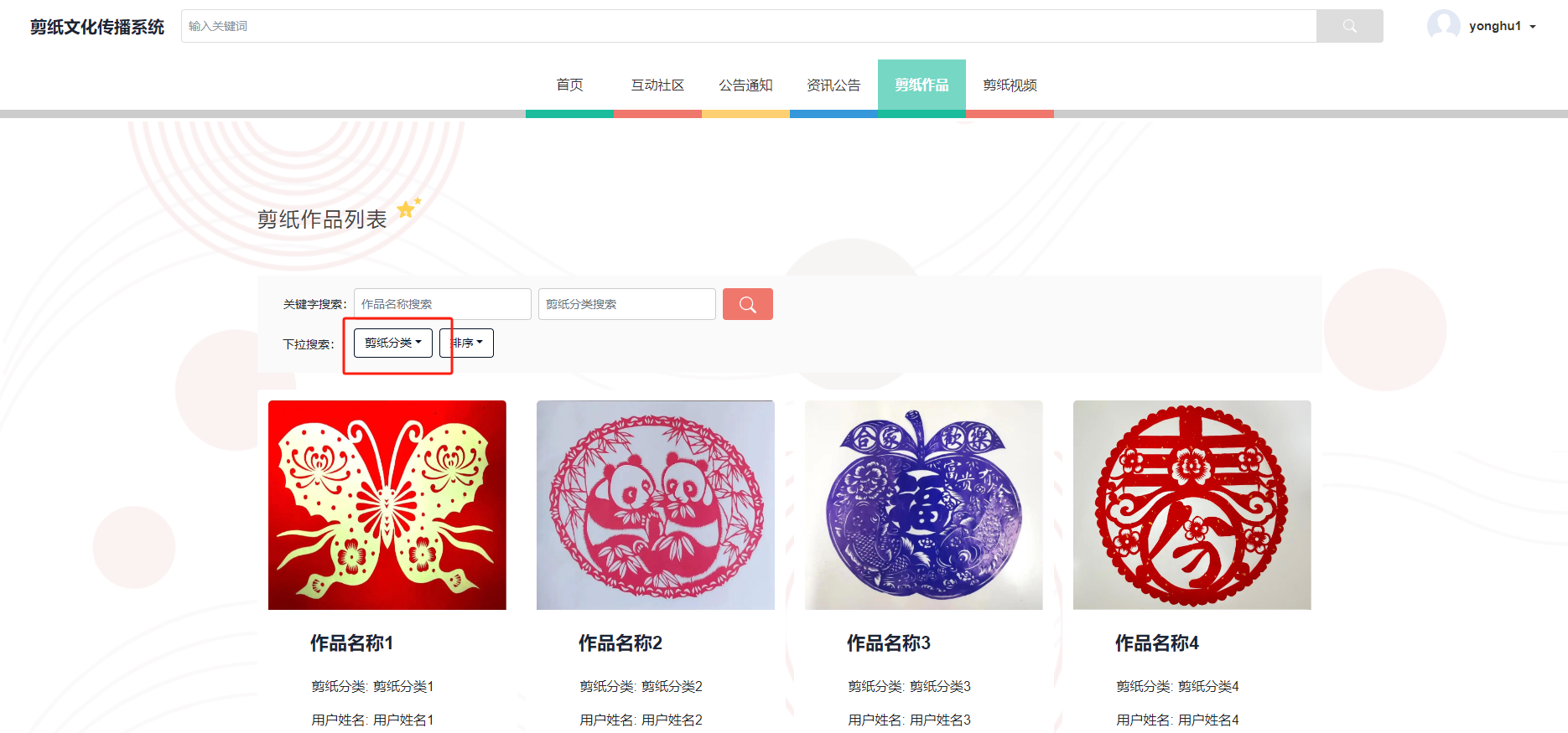 用户进入剪纸作品页面,浏览剪纸作品的图片、名称、描述等基本信息。通过搜索栏输入关键词或筛选条件,快速定位剪纸作品。可以点赞、收藏和评论。剪纸作品界面如下图所示。